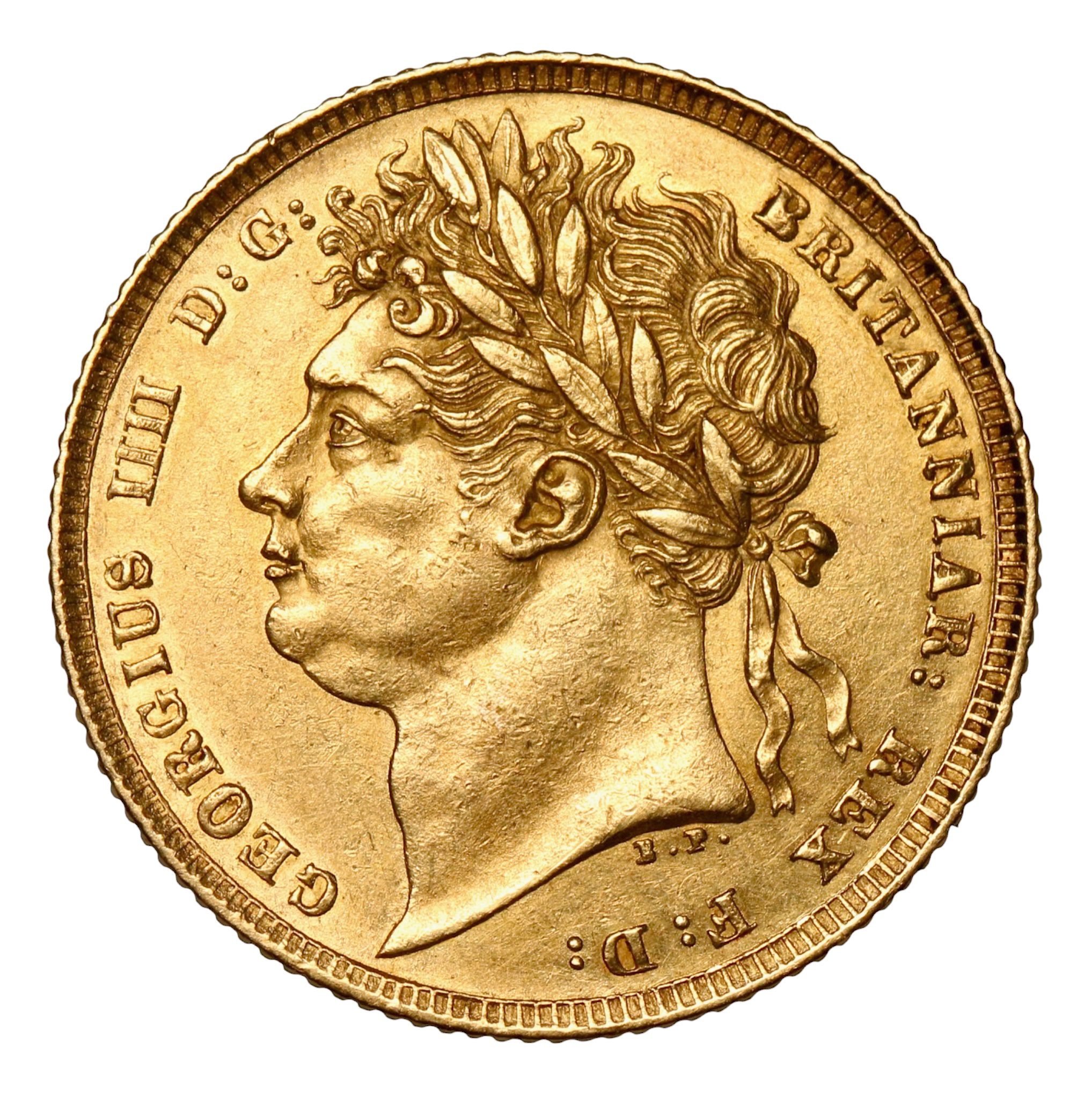 Designed by Benedetto Pistrucci the obverse features the George IV laureate head and is incribed GEORGIVS D:G BRITANNIAR REX F:D:. The Reverse bears St. George slaying the dragon